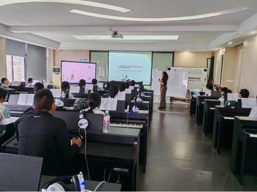 紧接着,游小敏老师带来了《无旋律伴奏的应用》钢琴课。通过教师的亲自弹奏,同学们对伴奏的两种形式——有旋律伴奏和无旋律伴奏有了直观的认识。游老师以《小汽车》为例,引导同学们唱旋律、弹旋律、编和弦,并进行技巧融合。在练习一级、四级、五级音阶的过程中,同学们不仅掌握了弹奏技巧,还学会了根据曲目风格选择合适的演奏方式。最终,在小组呈现环节,同学们不仅完美演绎了《小汽车》,还进行了拓展提升,学会了对无旋律进行装饰,加入了前奏及间奏的设计,展现了非凡的创造力。