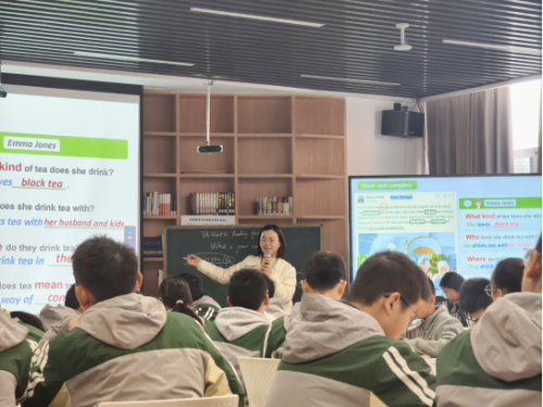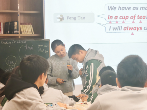 在此基础上,杨老师引导学生巧妙地提炼了一系列相关句型,为接下来的写作练习打下了坚实的基础。进入读后环节,首先通过集体朗读相关语句的方式,让学生们深切体会跟帖者对茶的深厚情感。随后,杨老师以Feng Tao和Emma Jones饮茶习惯的对比为例,引导学生深入探讨茶所承载的文化意义及情感价值,激发了学生们对茶文化更深层次的思考。