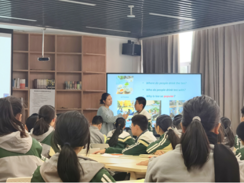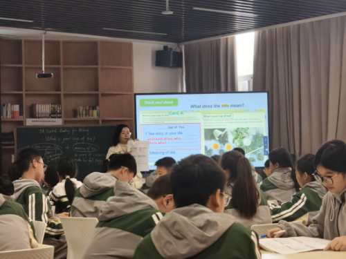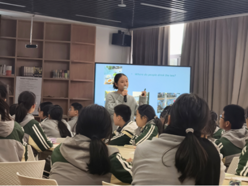 杨丽慈老师的课以一段关于茶文化的视频作为开场,以一种轻松愉悦的氛围和学生分享交流各自喝茶的体验。随后,学生们通过略读文章了解茶受欢迎的多重原因。