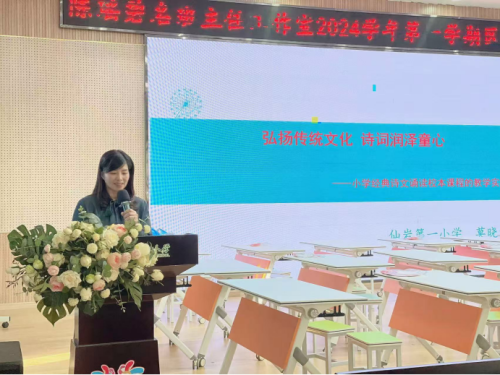 随后,莫晓慧老师作了题为《弘扬传统文化 诗词润泽童心》的主题讲座。天籁自鸣天趣足——做“诵读”兴趣的激发者;漫卷诗书喜欲狂——做“诵读”作品的引领者;春城无处不飞花——做“诵读”平台的搭建者;陶陶然乐在其中———做“诵读”路上的同行者,莫老师深入浅出地阐述了传统文化在现代教育中的重要意义,并分享了如何将诗词融入日常教学的经验和方法。