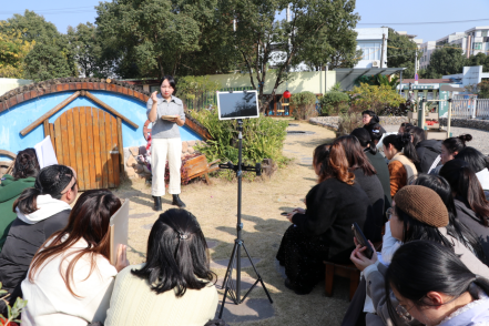 随后,刘茴茴老师为大家带来了题为《打造户外教室 升级自然游戏》的专题讲座。她深入剖析了自然游戏对幼儿身心发展的积极影响,指出自然游戏不仅能提升幼儿的身体素质和感官敏锐度,还能培养他们的观察力、想象力和创造力。同时,刘老师也分享了一些实用的教学策略和方法,帮助教师们更好地将自然游戏融入日常教学中,为幼儿创造户外游戏教室分区,丰富自然学习环境。