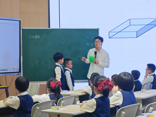 活动伊始,由林邦灶老师带来《认识平面图形》一课。林老师通过“拿-放-描”引导学生从立体图形中拓印平面图形,建立长方形、正方形、三角形和圆等平面图形,帮助学生建立“面从体来”的直观认知,学生能够进步感受“面从体来”,培养了学生的动手操作能力以及语言表达能力。 通过分一分的活动,通过分一分的活动,让学生初步认识这些平面图形的特征,并在介绍名称和样子时进一步完整地认识长方形、正方形、平行四边形、三角形和圆的特征。课堂中学生通过小组共学,感受不同图形的特征,深化概念理解。并让学生感受自己学习的成功喜悦。