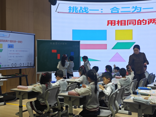 紧接着由徐轩妮老师带来《平面图形的拼组》一课。课堂以“合二为一”、“七十二变”、“火眼金睛”挑战赛为主线,设计了三个富有创意的教学活动。在课堂中,徐老师通过“合二为一”环节引导学生用两个完全一样的图形拼成学过的平面图形,徐老师提供了多种图形供学生选择,给了学生很大的创造空间,并通过分层汇报,让学生感知图形的特征,让学生能从平面图形的本质属性去思考,如“用2个长方形拼有两种情况,为什么两个正方形只有一种情况”,感受正方形边的特征,并渗透有序思考的方法。在拓展环节,徐老师引导学生用更多的相同图形自由拼组,感知各平面图形的特征及图形间的关系。通过“你还能用几个正方形拼成更大的正方形?”的问题让学生经历猜想、思考、验证的过程,发展学生初步的空间想象能力和推理意识,也为后续学习平面图形积累活动经验。