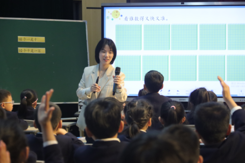 榕园学校的舒苗苗老师带领二(3)班的孩子们一起学习《1000以内数的认识》。孩子们一边数数一边感受十进制的魅力和新单位的产生,10个小方块拼成“十”,10条“十”变身一面“百”,当10面“百”层层堆叠成巨型立方体时,学生惊呼:“原来‘千’是这么来的!” 然后舒老师以学校二年级段的学生数为情境,引导孩子们借助点子图、小棒、方块,计数器来表征312,从直观、半直观再到抽象,利用数形结合的思想帮助学生理解数的意义,掌握数的组成,体会位值制。此外舒老师还设置了“从312数到1000”的数数活动,在多种数数方法中优化数数的策略。最后,舒老师还把“1000”置于在不同的生活情境中,发展学生数感。