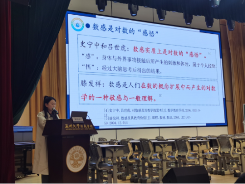 飞霞实验小学林杉杉老师以《数感的内涵与具体表现》为题作观点汇报,首先,她对数感的含义和具体表现进行了具体的阐述,分别对数的认识教学和估算教学进行分析,强调数的概念和运算的一致性。随后以“万以内数的认识”单元为例,在分析单元结构和核心素养的基础上,提出指向数感和运算能力的单元核心目标以及核心任务。