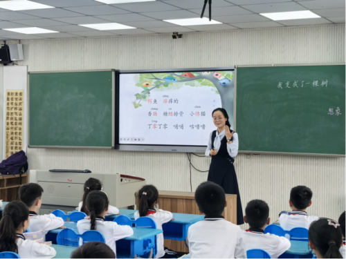 与此同时,在瞿溪一小的录播教室,陈晓炜老师带领三(1)班的孩子们共同学习《我变成了一棵树》。陈老师让孩子们自主探究课文,借由让学生在“了解变身,解开想象密码”的任务中,探讨了变身的原因,并通过品味文本和仿写练习释放想象力。在“交流趣事,初步感受奇妙”环节,学生们默读并分享课文中的趣事,感受作者的想象。陈老师的教学设计巧妙地融合了字词学习、文本解读、想象激发与书写训练,让学生在愉快的氛围中提升语文素养,让想象的种子在心中生根发芽。