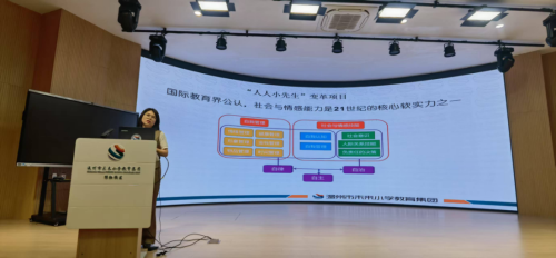 分享会伊始,金晓副校长率先登场,带来学校的特色项目——小先生自治项目。她从课程理念的根源讲起,深入剖析课程设计路径,再到具体方法引领,层层递进,将整个项目的架构清晰地呈现。在她的讲述中,学生的成长蜕变之路也徐徐展开:从最初专注管好自己,努力争做“小先生”,到积极服务他人,勇当领行“小先生”,最终实现完善自我,同学间互为“小先生”,完成了令人惊喜的成长跨越。