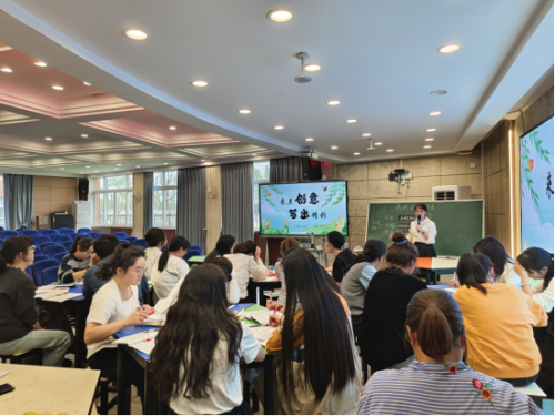 课后,张老师为我们带来了一场主题为《撬动思维:让语言表达有创意》的精彩讲座。讲座之初,张老师明确了瓯海区对创意表达的关切,紧接着便围绕“如何培养创意表达”展开细致的讲解。张老师从“训练形象思维,提升表达的生动性”“训练逻辑思维,提升表达输出的条理性”“训练发散思维,提升学生表达的独创性”三个维度循序渐进地引导我们如何帮助孩子们进行有创意的表达,从而助推孩子创新思维的再提升再发展,形成良性循环,促进学生核心素养的发展!张老师的讲座既有理论的深度,又具有实践指导的意义,为创意表达的教学点亮了一盏明灯。
