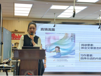 工作室成员周瑞老师以六下第三单元为例,作《情语恰当表达,真情培育真人》主题分享。通过“习作单元整组解读——借课文培养习作思维——单元策略分析”的思路,为单元整体教学提供了可视化操作范式。周老师利用“成长纪念册”情境,将文本细读与生活体验有机融合,让真实的学习情境自产生。