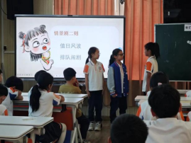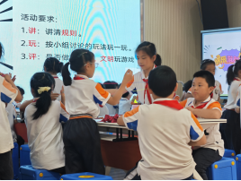 第二节课由获得瓯海区班主任基本功大赛的张丽莎老师执教主题班会课《一起“趣”玩吧》。张老师先由一个生动有趣的热身小游戏《萝卜蹲》引入,同学们一下子就进入了学习状态。接着通过“游戏驿站”视频导览方式分享了丰富多彩的课间小游戏,学生的学习热情被充分激发。随后通过“游戏迷路了,请你把它送回家”的分类决策活动,小组讨论选出不同场地适合的小游戏,通过小组分享懂得玩游戏就要“守规则”。接着通过两难情境进行思辨,学会邀请同伴共同游戏,懂得协商和尊重同伴。最后的“快乐游戏”环节,点燃了孩子们的学习热情。本节课张老师引导学生经历规则内化、场域认知、协商沟通、创意实践的全流程体验,实现课间活动从无序嬉戏到素养培育的升级,有效培养了学生的社交力与游戏素养。