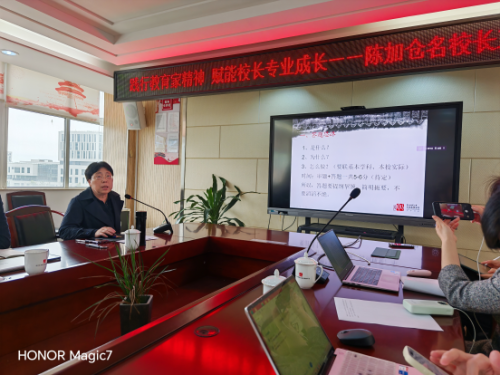 瓯海区发展中心陈加仓院长对学校发展提出三点建议:一是校长要做 “顶天立地” 的事,对标党和国家要求、课程标准及政策文件,把握数字化趋势,强化政治担当与责任意识;二是立足学校全局,梳理办学框架与理念,聚焦校长六项职责,以国际视野、创新精神和专家指导构建育人格局;三是提升表达能力,抓住机会讲好学校故事与办学体系,传递教育理念、塑造品牌形象。