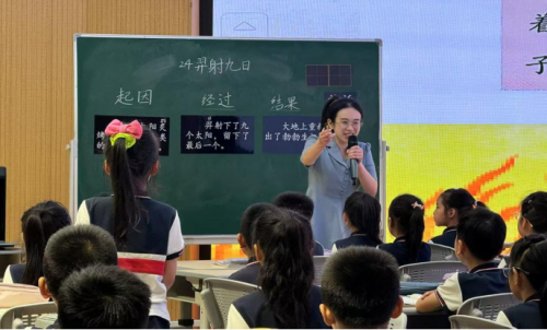 随后,工作室成员孙荣荣老师与二(4)班的同学们带来了另一堂精彩的课例《羿射九日》。孙老师巧妙地将故事情节与字词学习相结合,通过厘清神话故事的起因、经过和结果,深入学习后羿射日的经过,感受神话故事的神奇。在朗读和想象中,学生畅游于神话故事的海洋,在生动活泼的课堂氛围中学习讲神话,分享神话。