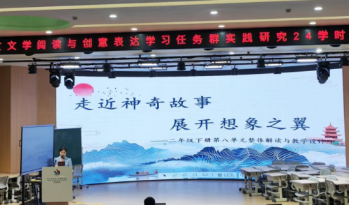 陈楠老师以二下第八单元为例,作《走进神奇故事 展开想象之翼》主题分享。陈老师从“单元整组解读”“单元任务群构建”两方面,深入浅出地分享了单元整组教学的新路径,以“文学阅读与创意表达”学习任务群为核心,结合本单元任务群的学习要求,创设单元整组“走进神奇故事 展开想象之翼”为主题引领的语文实践活动,引导学生在具体的学习情境中,开启本单元的阅读之旅,在丰富的想象中,表达自己的独特感受,分享自己的内心体验,提升想象和创意表达的能力。