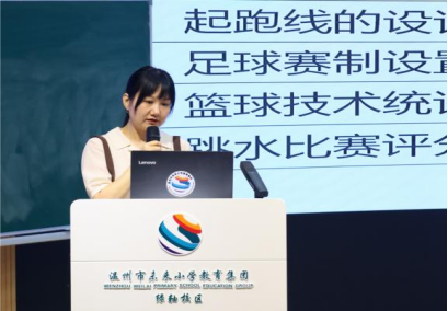 温州市实验小学苏娜老师首先执教“体育中的数学”起始课《问题墙的产生》。她基于学生课前提出的真实问题,引导他们辨析何为“体育中的数学问题”,进而聚焦“如何确定200米跑起跑线”展开深入研讨,帮助学生初步形成研究计划。瑞安市瑞祥实验学校吴子航老师从课标解读、目标定位与课时规划等方面,系统阐述了团队的研究脉络,清晰呈现从主题确立到课例成型的完整路径。温州市城南小学周晓林老师以《确定起跑线》为例,分享了学生从“主题—问题—课题”的自然研究路径,体现了项目化学习在激发学生主动探究与持续反思中的积极作用。洞头区教师发展中心杨业老师在《依托“主题实践”培育“三会素养”》专题发言中,聚焦跳水、篮球、足球等真实体育情境中的数学问题,从研究路径、实践历程、阶段成果与教学反思四个维度,系统展示了团队在跨学科主题学习中的实践探索。