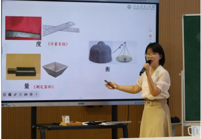 在“度量衡”主题环节,苍南县教师发展中心黄静老师首先围绕项目目标与单元框架进行阐述,清晰勾勒出“为何学、学什么、如何学”的整体实施路径,为后续教学实践奠定基础。龙港市姜立夫小学唐慧荣老师随后开展《初识度量衡——问题墙的产生》模拟上课。她以“关于度量衡,你想研究什么?”为驱动性问题,引导学生提出个性化疑问,逐步凝练关键主题、组建研究小组并制定初步计划,体现以学生为主体的教学设计。温州市中通实验学校邹安琪老师执教《走进度量衡》一课,从“度量衡的历史演变”切入,组织学生动手操作“商鞅方升”等古代量器,在实践测量中自然引发对计量单位演变过程的思考,实现文化体验与数学思维的有机融合。苍南县第三实验小学钟政营老师则聚焦项目成果展示环节,系统介绍从任务设置、成果样态到展示流程的整体设计,展现项目化学习在推动学生深度探究与综合素养提升方面的有效路径。