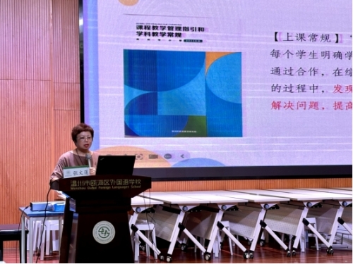 瓯海区第二实验小学的张文莲老师作了《多维融合,助力“跨学科学习”破界》主题发言。她基于新常规中关于跨学科学习的备课与上课要求,结合“晒秋”情境任务,分享了融合科学、美术、音乐等学科的实践案例,围绕“结合单元主题进行跨学科拓展”“融合整本书阅读设计进阶任务”“整合资源开展社会实践”等融合点,阐述了跨学科学习的实施路径,最终实现学习破界。