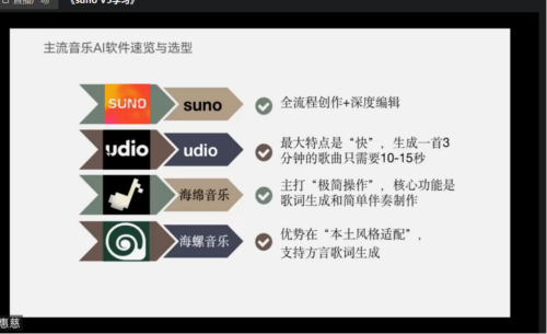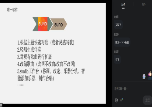 活动开篇,林惠慈老师通过屏幕共享开启 AI 音乐软件核心功能分享,系统梳理了主流工具的特性与教学适配场景。林老师重点介绍了三款实用软件:Suno 以 “全流程创作 + 深度编辑” 为核心优势,生成一首 3 分钟歌曲仅需 10-15 秒,高效适配课堂快速创作需求;海绵音乐主打 “极简操作”,专注歌词生成与基础伴奏制作,降低新手教师使用门槛;海螺音乐则凭借 “本土风格适配” 亮点,支持方言歌词生成,为地方特色音乐教学提供新思路。每款软件的功能解析均搭配线上界面演示,让老师们直观掌握工具核心价值,为后续实操奠定基础。线上实操演,玩转歌曲改编教学新方法。