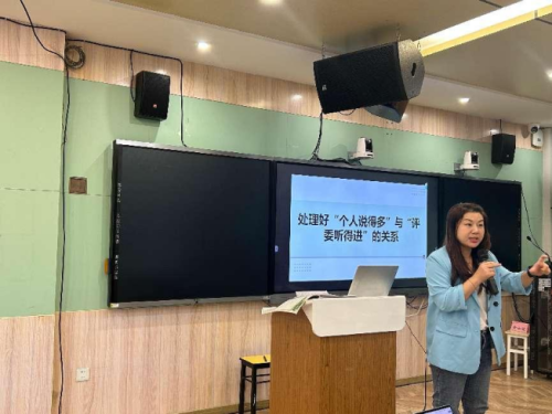 紧接着,项老师围绕“如何平衡‘个人讲述’与‘评委接收’的关系”这一核心困惑,带来了一场题为《如何说课》的专题讲座。项老师匠心独运,将方才三位老师的说课展示作为贯穿全程的案例进行剖析。 她指出,成功的说课并非教师的单向信息输出,而应是基于充分准备下的有效沟通与交流。她强调,说课者需树立强烈的“听众意识”,并以此观照凌老师的逻辑架构、郑老师的情境创设与李老师的生本理念,精妙论证了如何在有限时间内,通过巧妙的结构设计、精准的要点提炼以及富有感染力的表达,做到语言精炼、重点突出,从而将教学设计的精髓高效传递,变“单向灌输”为“双向共鸣”。