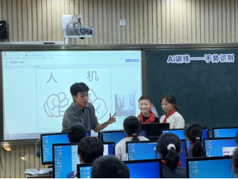 随后,瓯海区梧田南村小学的潘正华老师带来了《AI训练——手势识别》一课。潘老师以“剪刀石头布”的人机对决游戏巧妙导入,引导学生依托希冀学习平台,亲历了“数据采集、模型训练、验证模型”的完整科学流程。在“手势识别攻防对决”环节,学生们通过不断优化置信度策略来应对干扰,课堂气氛热烈。这两节课充分体现了从“经验教学”向“智能设计”的转变,成功将抽象的算法逻辑转化为直观的探究过程。