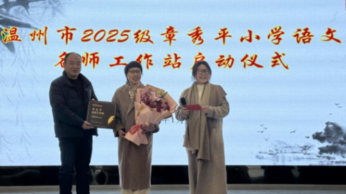 萧江二小温积必校长从名师章秀平手中接过沉甸甸的牌匾,标志着温州市 2025 级章秀平小学语文名师工作站正式落户萧江镇第二小学。这不仅是一份荣誉,更是一份使命,预示着工作站将成为培养优秀语文教师、探索教学改革的重要阵地。