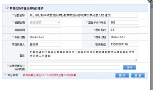 1. 学分录入。学员凭通知,联系学校“省平台”管理员,按要求录入学分。具体步骤如下:学校管理员登陆浙江省教育厅教师培训管理平台(单位账号登录)-选择【其他类型转换】-【其他优质专业培训申报】-点击【增加】-【填写相关内容】(可参考图1)-【提交】-选择“参训教师”(见附件中录入本校所有相关教师)