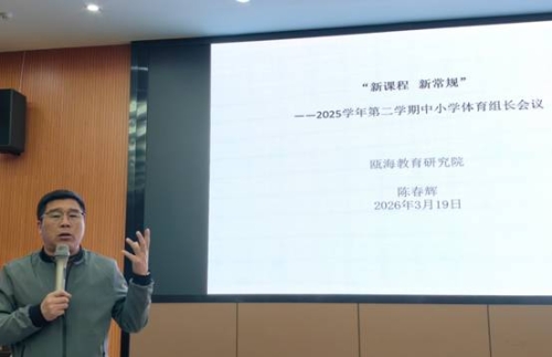 春日焕新,研途共进。为深化体育课程改革,落实课程核心素养,推进温州市教学新常规 “深耕行动” 与各校体育工作 “一校一案” 落地实施,提升体育教师育人能力,3 月 19 日下午,瓯海区中小学体育 “新方案新常规” 主题研讨暨 2025 学年第二学期研训工作会议在瓯海外国语教育集团上河乡校区顺利举行。全区中小学各片区体育大组长、各学校(含校区)体育组长及骨干教师、24 学时培训班学员、陈春辉名师工作室学员、2024 级发展期培训班学员齐聚一堂,共研体育教育提质路径。