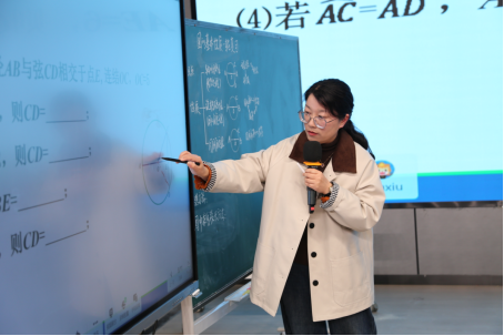 陈慧秀老师带来《圆的基本性质复习》。她创新采用“一卡一单”载体,以课前画图任务为抓手,引导学生在作图中回顾垂径定理、圆心角与圆周角关系等核心性质;课中以问题链驱动,围绕“线段求解”展开深度研讨,结合典型例题与变式训练,打通勾股定理、相似三角形等解题路径。学生在小组合作与成果展示中,实现了“从画图感知到逻辑推理”的思维进阶,有效提升了几何推理与综合运用能力,为后续综合复习筑牢基础。
