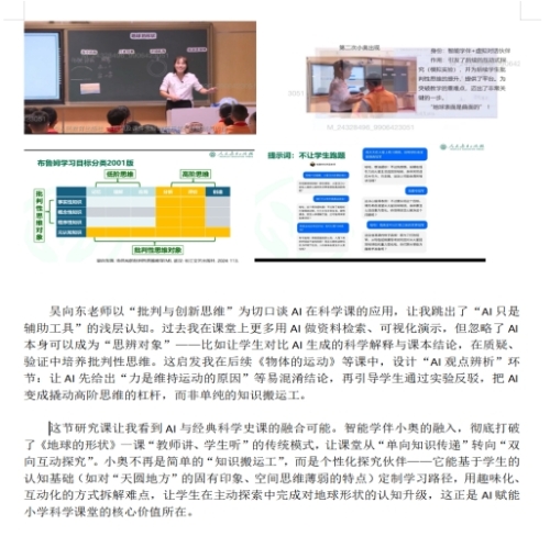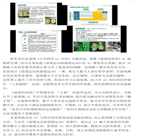 郭浩老师结合自身教学实践反思道,过去在《物体的运动》等课中,仅将AI用于资料检索与可视化演示,此次学习让他深受启发,计划尝试让AI给出易混淆结论,引导学生通过实验反驳,以AI为载体培育学生的批判性思维。彭春苗老师结合自身设计的《直线运动和曲线运动》AI课堂表示,此前仅用数字人引导课堂流程、提升互动趣味,通过观摩《地球的形状》课例,明确了AI应深度融入探究过程,可设计开放性追问,引导学生质疑探究,让技术真正服务于思维进阶。