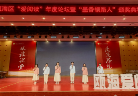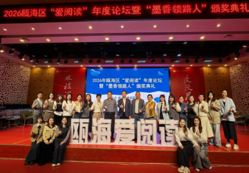 四月瓯海,春意盎然,书香四溢。4月21日,2026年瓯海区“爱阅读”年度论坛暨“墨香领路人”颁奖典礼在温州大学城附属学校隆重举行。瓯海区各教育领导及各校“爱阅读”项目负责人、骨干教师代表及胡月名师工作室的学员齐聚现场,共话阅读教育,共启书香新程。