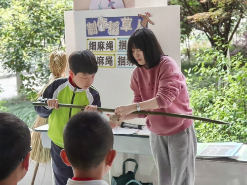 活动第一环节,工作室成员林若若老师进行《制作稻草人》的课例展示。林老师先是以谈话、猜谜形式导入,调动学生的积极性,然后采用“试错体验——自主发现——主动学习——掌握方法”的点对点的突破方式,帮助学生初步掌握稻草人的制作方法。整节课林老师既考虑到学生的年龄特点,将制作难点分步推进,又考虑到室外课的局限性,为每组提供稻草人设计样例,让每个学生都乐在其中。