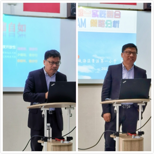活动第二环节,由瓯海区名师陈长春老师为全体成员带来《小学综合实践活动STEM分析策略》的专题发言。陈老师先就STEM理念下的综合实践活动主题课程开发与实践的背景进行了说明,并分析了STEM在综合实践课堂实施的可行性;同时陈老师还与成员们分享了他对综合实践活动主题整合的几点思考,对基于STEM综合实践活动主题的实施路径他更以真实的案例为佐证,这些具有实操性的可借鉴经验让在座学员们都深受启发。