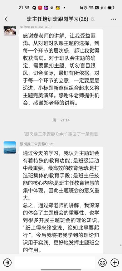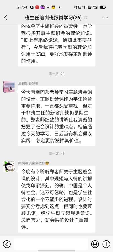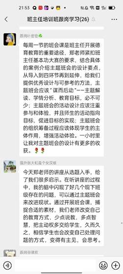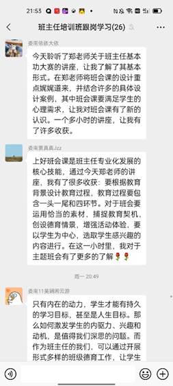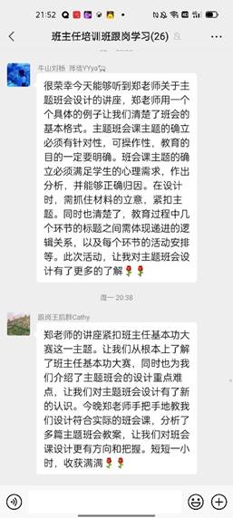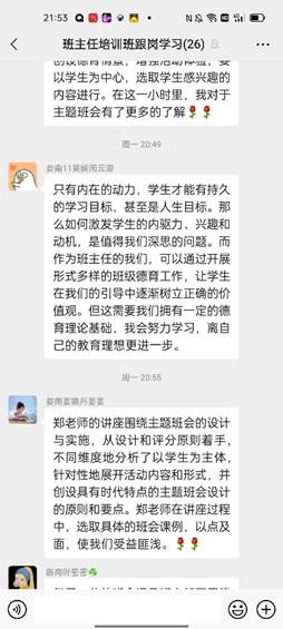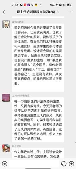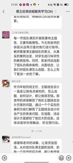 讲座结束之后,大家还聚在微信群里发表自己的感悟,畅所欲言。学员们都纷纷表示,从郑老师的分享中收获了许多。对新教师而言,这更是一次难得的机会,可以聆听资深专家关于主题班会设计与实施的分享,不仅是理论上的支撑,更关键的还有操作的指导,让教师们对班会课设计更有方向和把握。
