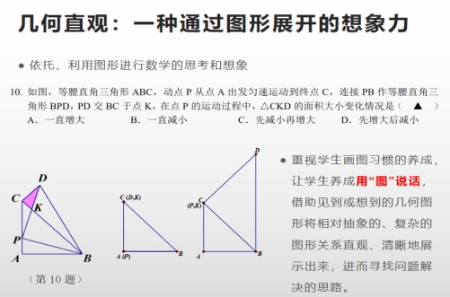 为了更具体的说明,如何在命题时突出学科核心,卢老师以一个动态的几何图形为基础,旨在让学生养成画图的习惯,并希望学生能够通过“看图”得出答案,从而培养学生对图形的想象力。