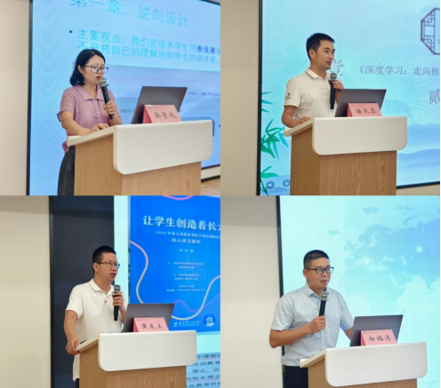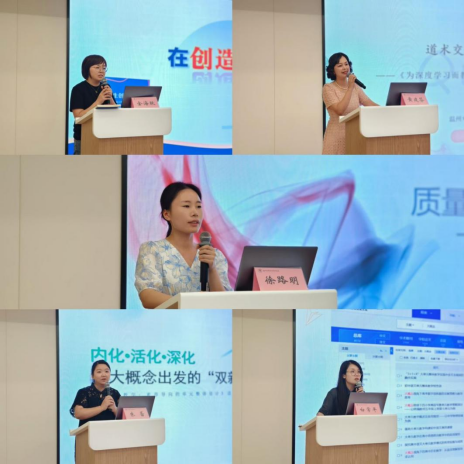 小学教育研究室金海跃主任作题为《在创造中长大》的交流分享,总结知过去、明当下、晓未来的内容呈现逻辑,指出要让学生创造着长大、让学生像专家一样的思考、为生活和学科而学、和学生一起创造教师观;幼教教育研究室黄建芬老师作题为《道术相融:让学习深度发生》的交流分享,指出要让学生成为推动者、思想家、擅长倾听者,链接学前阶段特征改良“三阶五策”阅读行动,用高阶提问包裹低阶提问;评价研究室徐路明老师作题为《质量从何而来?——思维技能给的答案》的交流分享,以区学习品质检测结果分析为切入点,介绍教学过程中要渗透培养学生的七大思维技能,以帮助学生加深对核心内容的理解,评价中也应增加对学生思维技能的考察与测评;教师教育研究室朱蕾主任作题为《内化·活化·深化——从大概念出发的“双新”实践》的交流分享,分享了自己的三类读书观,基于学科例子详细阐述了读懂1个概念、了解2中思维和实践3种路径的内涵与具体应用;文宣室白常平老师作题为《大道至简 殊途同归》的交流分享,总结大概念的内涵特征包括可迁移性、专家思维和概念性理解,大概念教学的三要素包括大概念、核心问题和核心任务,强调学生达成素养具体表现更重要,把握学科本质,读懂教材变化背后的编写逻辑。