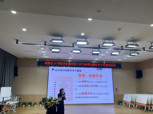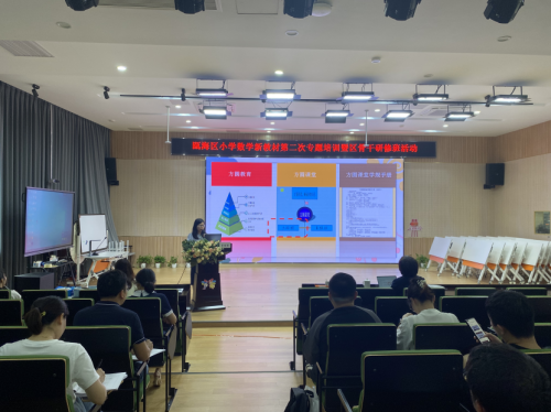 培训的最后瓯海区数学教研员金海跃带来了专题讲座《从“0”开始,用“♥”出发——人教版小学数学一年级教学建议》。小学一年级的数学虽简单,但很厚重。金老师建议全区所有的一年级数学老师要立足新的起点,重视学生习惯的培养,夯实学生的数学学习基础。要突出数概念的本质,加强数概念的教学;重视运算意义的理解,夯实运算基础;利用数量关系深化对运算意义的理解,寻找解决问题的基本步骤和思路,逐步启蒙学生数学学习方法。