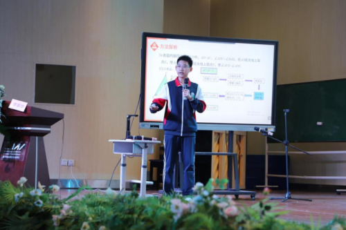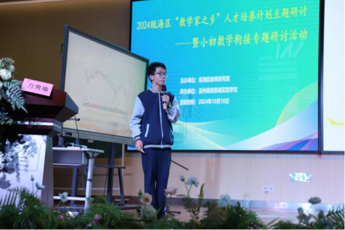 温州大学城附属学校五(3)班的谢陈潇同学分享了《巧求面积》,他从整体减去空白、分割法、等积变形3个角度切入去解决面积问题,完整严谨的表达,充分体现了他的思维能力,表达能力和逻辑分析能力。梧田一中的黄嘉煊同学带来《构全等妙法,寻相似巧解--浙江省2024年中考数学第24题》,他从5个不同角度分析圆和三角形中相关线段的数量和位置关系。瓯海区实验小学前汇校区的万隽瑜同学带来小课题《探秘轮回大黑洞》,从列举验证到严谨证明正方形数列的大黑洞原理,通过自己的大胆猜想,小心求证,给我们带来了精彩的课题。瓯海区外国语学校的林加信同学带来小课题《柳暗花明,探究骑士巡逻问题》,他分享课题研究的经验,要学会向他人或书籍寻求帮助,找到自身思维的缺陷,裨补缺漏,定能有所收益。