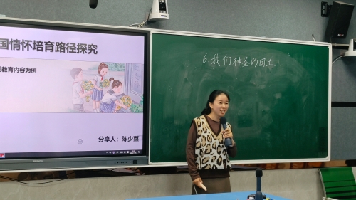 龙港市第二小学的陈少菜老师以《道德与法治家国情怀培育路径探究——以五下历史主题教育内容为例》为题进行了讲座。陈老师以课前深挖资源线,渗透爱国意识,课中紧扣教学线,明确爱国志向,课后巧拓实践线,激发爱国行为,既有宏观的视野,又有微观的剖析,聚焦以五下历史主题教育内容,结合道德与法治课程的特点,探讨如何在该课程中有效培育学生的家国情怀。