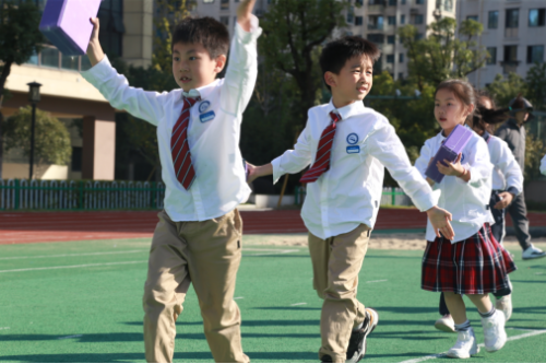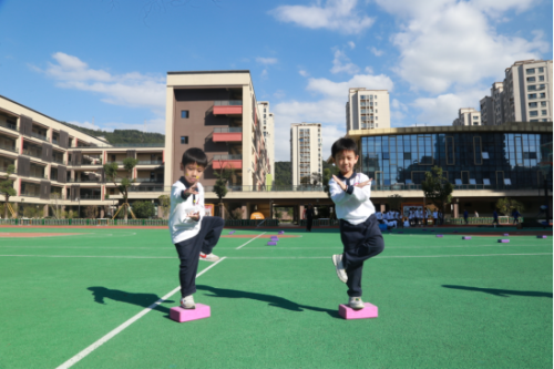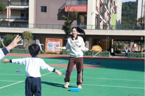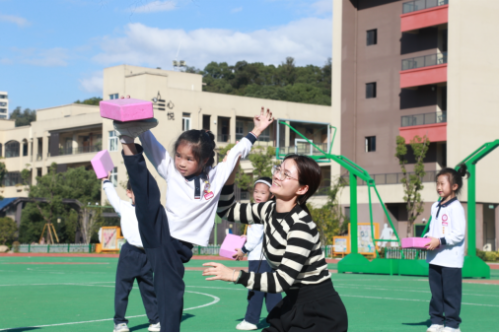 首先开课的是来自沈岙小学的陆刊刊老师。陆老师为师生们带来了一次活力四射的体育课堂。在热身环节,富有节奏感的音乐和老师生动的示范,瞬间点燃了孩子们的热情,充分调动了身体的各个关节。在教学过程中,老师不仅关注学生的动作规范,更注重激发学生对体育运动的兴趣。对于表现出色的同学,及时给予表扬和鼓励;对于有困难的同学,耐心地指导和帮助。同时,课程中还巧妙地融入了小组比赛,培养了同学们的团队协作能力。