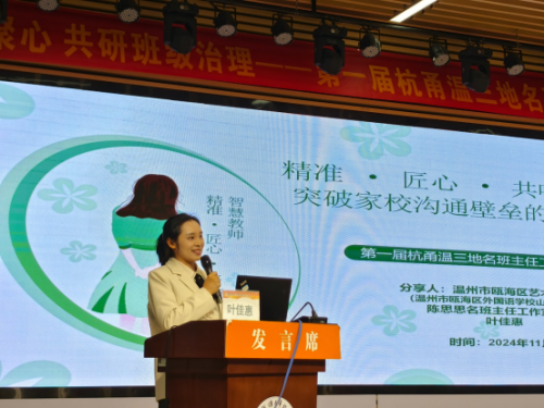 2024年11月8日,温州市名班主任陈思思携其工作室成员,亮相第一届杭甬温三地名班主任工作室联谊活动。陈思思老师不仅是温州市陈思思名班主任工作室的领衔人,更是温州市年度班主任的杰出代表。