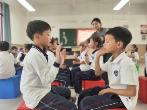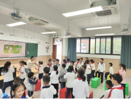第一节课由温州绿轴小学潘森怡老师执教《打花巴掌》。课始,潘老师从“童谣”这一主题导入,让学生们体验“你拍一我拍一”的游戏。接着,带领学生们探索北京童谣《打花巴掌》,从感受歌曲情绪,到跟随老师做“采花”动作,循序渐进地学唱歌曲,最后能边唱边动呈现完整的歌曲。整节课学生们在快乐的气氛中学会了《打花巴掌》这首歌曲。潘老师的课堂气氛良好,能够时刻吸引学生的注意力,教学设计从学生的兴趣入手,将唱游、律动贯穿始终,一方面激发学生兴趣,另一方面引导学生积极参与到音乐教学活动中去。
