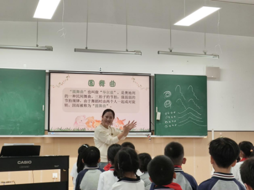 第二节课由瓯海区仙岩华侨小学的叶琦琦老师执教《森林“舞会”》。叶老师给学生们创设了一起去参加森林舞会的情境,分别聆听三段音乐片段来分辨对应的动物形象。结合主题音乐的聆听学习、观察老师舞步的变化、跟随音乐画图形谱等教学手段,形象直观地感受“调皮的小狗”这一音乐形象。在这节课中叶老师创设了丰富多彩的活动,让学生感受歌曲带来的快乐情绪,从而让学生在快乐中学习,在快乐中享受音乐。