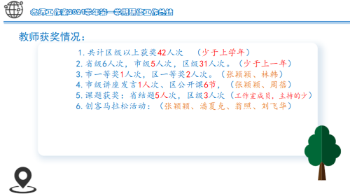 会议第二项,纪老师从以下五个方面对工作室一学期的活动进行总结与梳理: