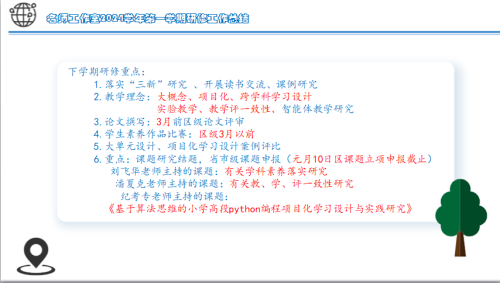 陈旭珍老师回顾本学期教学与学习成果,团队在纪老师带领下,参与了多项教学和学习活动,包括算法问题解决、“OKR 工作法”学习以及编程学习等。特别提到了在第一届人工智能培训的学习体验,强调了教学方法的创新和实用性。讨论中也指出了省学习平台使用过程中存在的问题,如文件上传速度慢等。