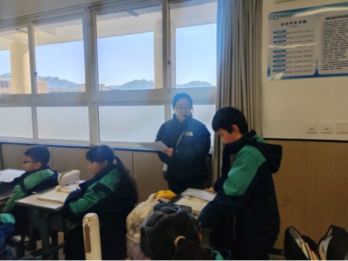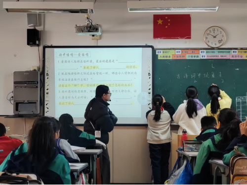 徐歌老师执教《古诗词专项》复习课,徐老师巧妙地将古代文人“曲水流觞”以诗会友的传统融入课堂,带领学生们复习五年级上册的十一首古诗。课堂上,“曲水流觞”的热身赛“画中有诗”拉开了序幕,学生们根据图片猜背古诗,兴趣盎然。在“曲水流觞”的第一站“诗中有画”这一环节,学生们以小组为单位,完成了学习单上的相关题目。在“诗中悟情”环节而后,“诗中明理”、“诗中明志”两个环节依次展开,加深了对古诗词的理解和记忆。