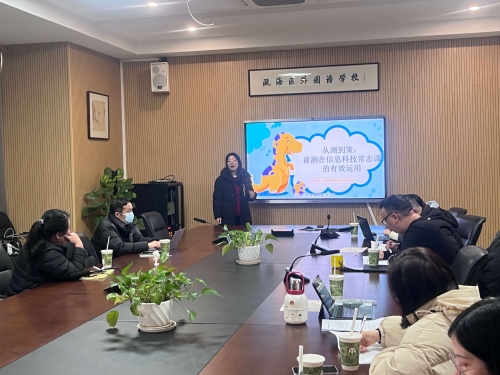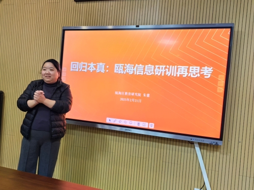区教育研究院教师教育研究室副主任、中小学信息科技研训员朱蕾老师以《回归本真:瓯海信息研训再思考》为题,详细介绍了温州市“四学五化”新课堂的具体含义以及“区“双联·三式”信息科技研训模式,关注同域联结,跨界联结。同时她介绍了本学期的工作目标和要求,为区信息技术教研工作在新学期的开展绘制了清晰的路线图。她强调了片区教研组建设深化的必要性,要求教研组成员间要加强交流与合作。