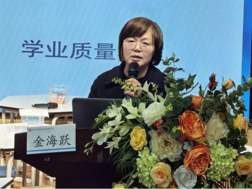 瓯海区教育研究院的教研员金海跃老师做了《聚焦教学评一致性,赋能区域学科发展》专题发言。她从“教学评”一致性的理论内涵出发,分析了区域教学面临的素养缺失、评价盲航、思维缺席等问题。具体介绍了”厘清教什么—预设怎么评—设计怎么学”的“三位一体”行动模型和具体做法、区域支持策略。通过命题微变脸、序列化专题培训、实战性校本研修比拼与创新性亮相教研等,有力促进教师专业成长,为提升区域数学教学质量筑牢根基。