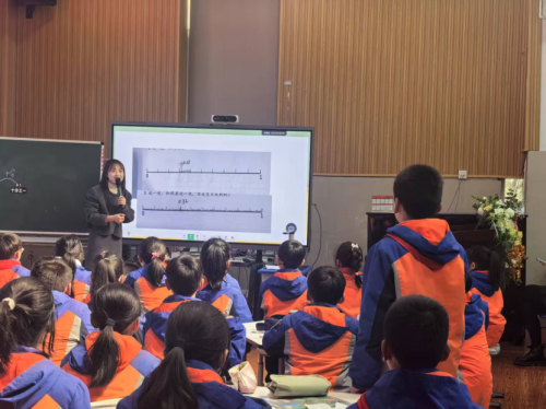 下午第二节课由来自乐清市北白象镇第一小学的尤婉老师和四(3)班的孩子携手带来《小数的意义》一课。尤老师以名句“数,是数出来的”为切入点,以“用数表示数线图上的点”为任务主线,带领孩子们以不断细分的方式,创造出0.1、0.01以及更小的计数单位,并用计数单位数出小数,从而帮助孩子们逐步构建起对小数意义的深刻理解,同时实现数的认识的一致性。