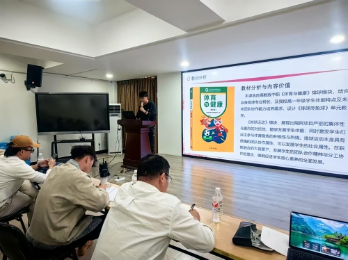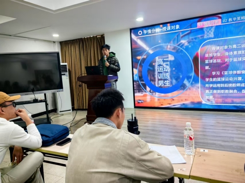 三位体育教师提早进行会议室进行准备,他们分别就如何将信息化技术融入体育课进行了精彩的说课。每位名师都带来了自己独到的见解和实践案例,通过PPT展示和现场演示,向我们展示了信息化技术在体育教学中的多样化应用。