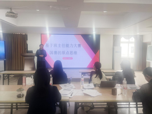 随后,温州市教育教学研究院周丽芳老师带来专题讲座《基于班主任能力大赛国赛的原点思维》。周老师以全国班主任能力大赛评审标准为切入点,围绕班级建设方案设计、主题班会创新实践等内容,剖析了新时代班主任的核心素养与能力要求。讲座内容既有理论高度,又贴近实际,为参赛教师提供了宝贵的备赛指导。