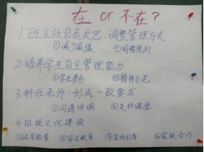 第三小组,融化了“严厉下的坚冰”。第三小组的舒鑫婷老师,在讲述时,从“班主任的自我反思、学生自主管理能力的培养、科任老师的协同配合、班级文化的建设”等四个角度,调整班级的学习风气和班级建设。因为“严格”不等于“高效自律”,孩子们长期处于班主任的威压中,是很难形成自觉自律的学习风尚的。因此,班主任首先需要对自己的管理模式和语言风格进行调整,让孩子们“敬”他,而非“畏”他。同时,多听取孩子的意见,让孩子的想法容纳到班级建设中,在无形中增强孩子们的主人翁意识,成为班级的“小老师”。并不断表扬可以自我管理的小朋友,树立榜样。还要与任课老师多沟通,形成一致的班级管理体系。最后,不断利用学校活动、班级活动,加强班级的凝聚力,进行班级文化的建设,通过正向引导、家校合作,培养孩子们的责任感,深切认同“学校是我家”这一观点。